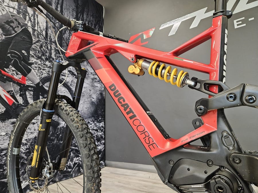 Bicicleta enduro con cuadro de carbono, motor Shimano EP801, batería integrada de 630Wh, recorrido delantero de 180 mm, trasero de 170 mm, frenos de 4 pistones, ruedas mullet, tija telescópica.