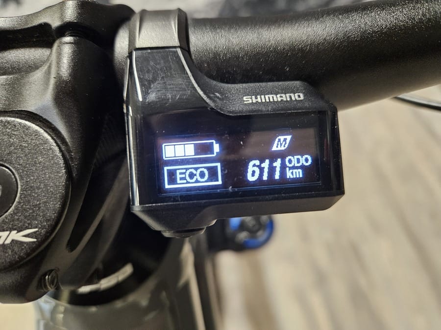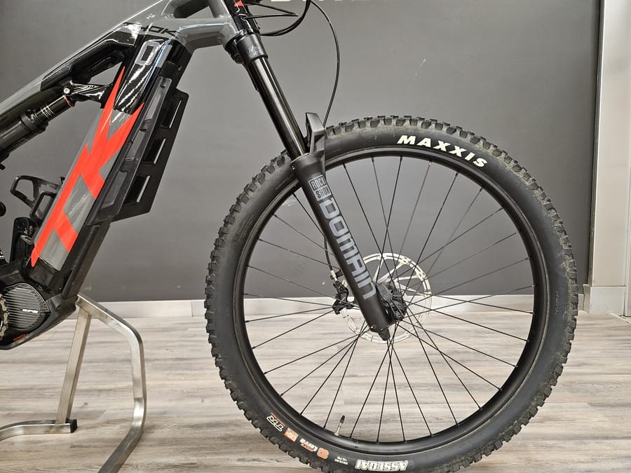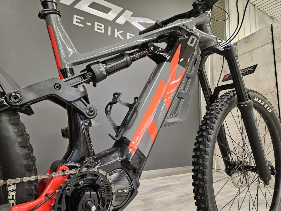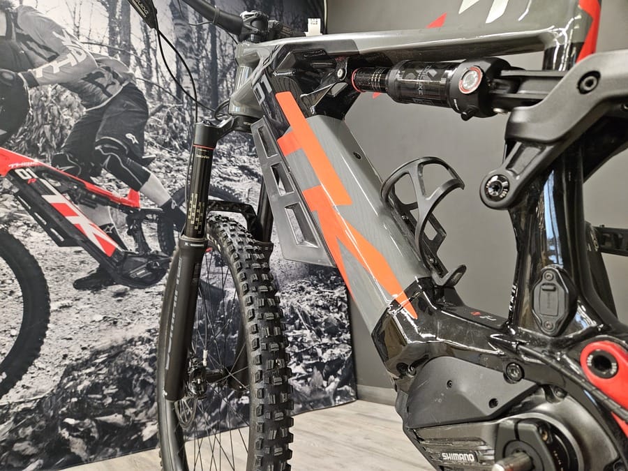 Enduro con cuadro de aluminio, motor Shimano EP8, batería integrada de 630 Wh, recorrido delantero de 170 mm, frenos de 4 pistones, ruedas mullet, tija telescópica.