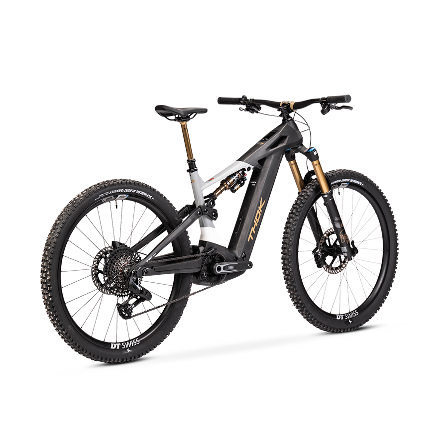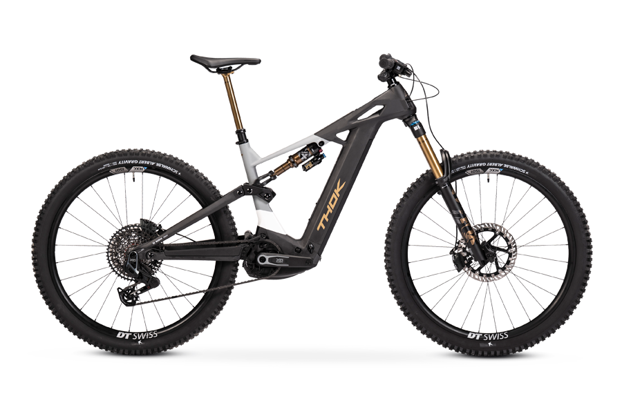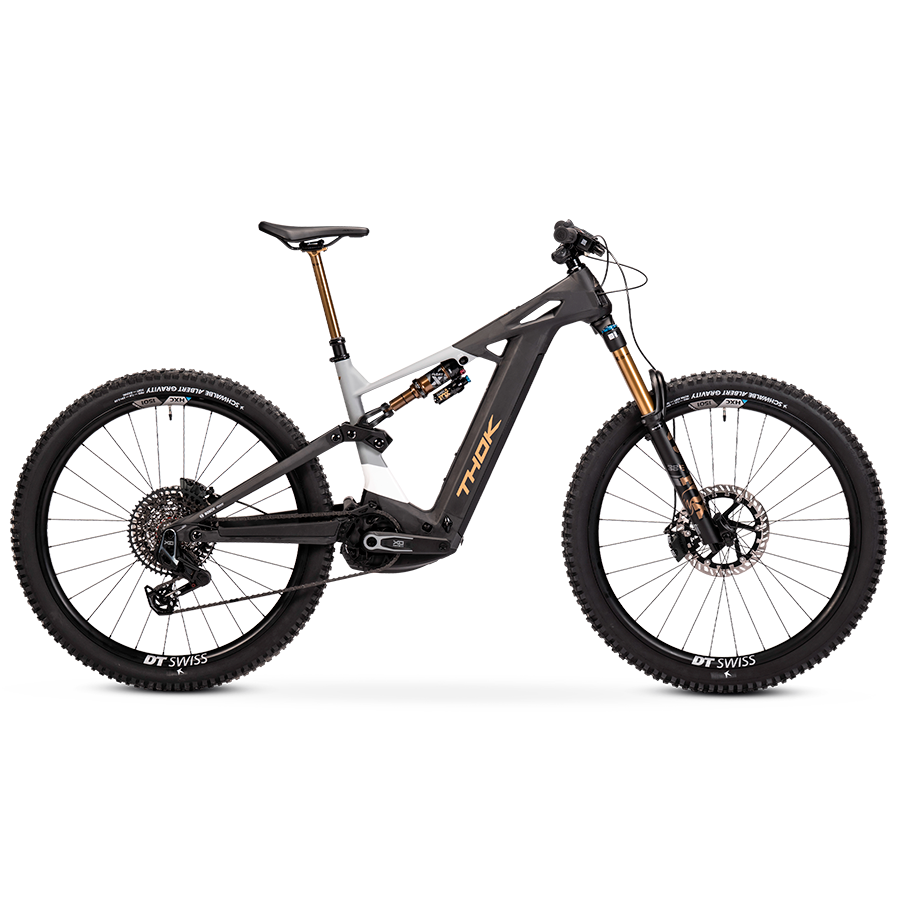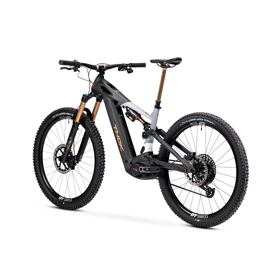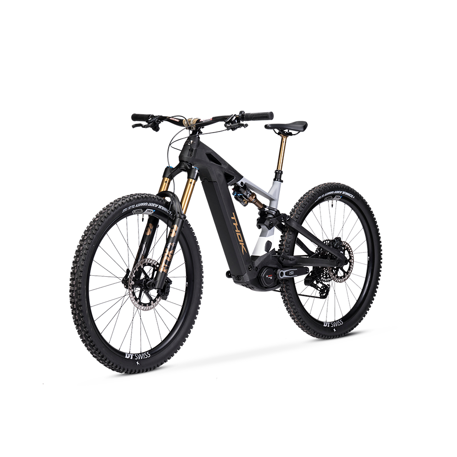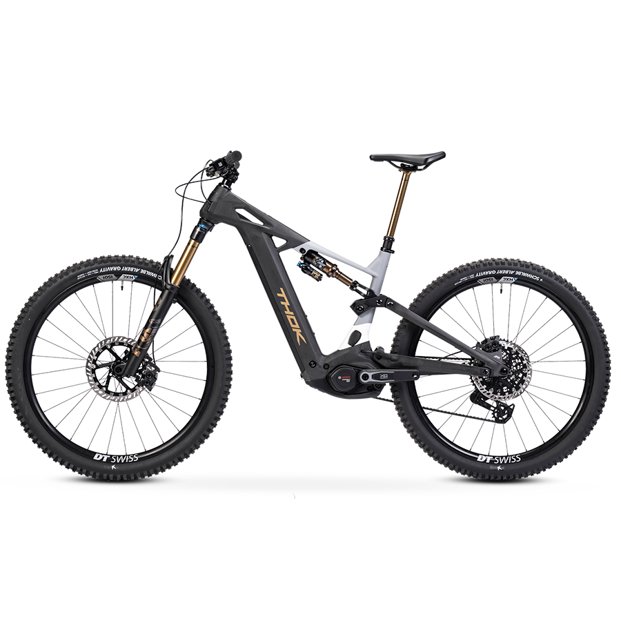 THOK – Carbon fiber (also High Module), headtube tapered 1.5, 29” geometry with flipchip, 27,5” compatibility, integrated down tube battery, UDH Hanger tecnology, enclosed internal cable, fully sealed cartridge bearing, 150 mm travel.