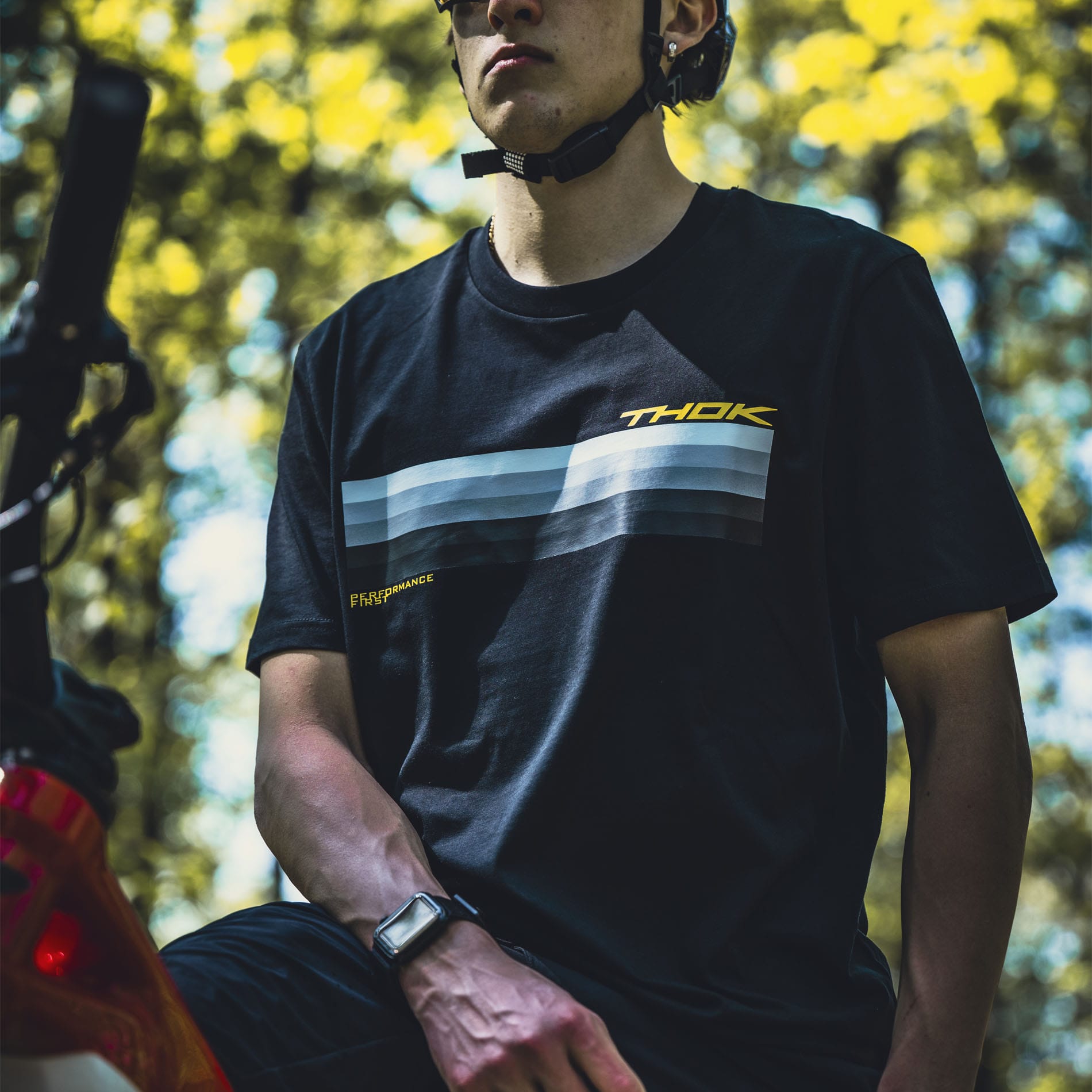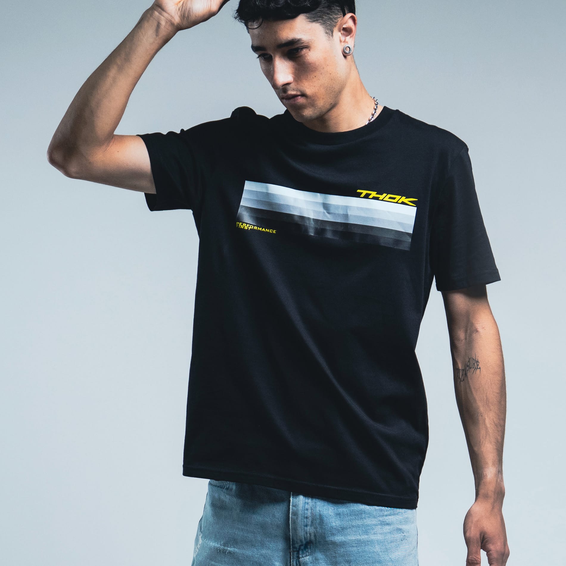 - Banda grafica orizzontale a contrasto sul petto e logo THOK