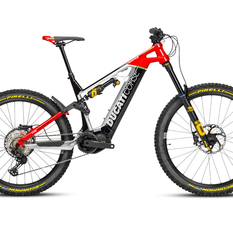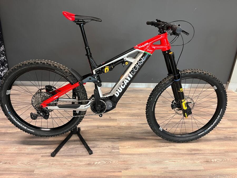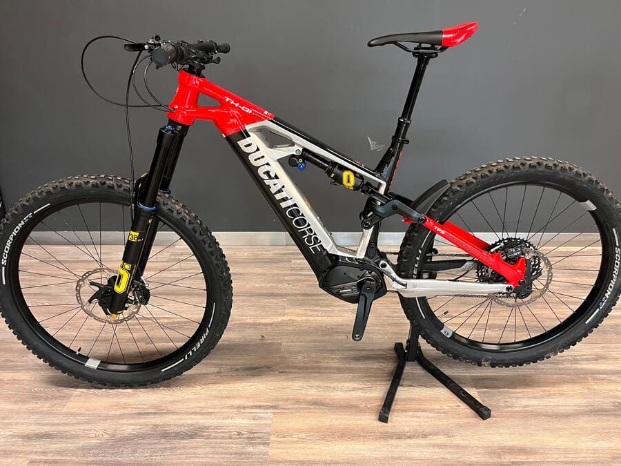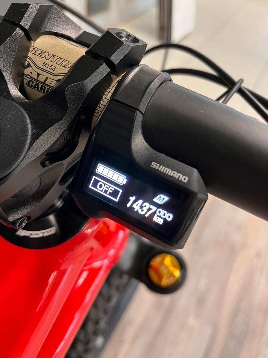 Enduro con telaio in alluminio, motore Shimano EP8, batteria integrata da 630Wh, escursione anteriore 180 mm, posteriore 170mm, freni a 4 pistoni, ruote mullet, reggisella telescopico. Telaio Pellicolato.